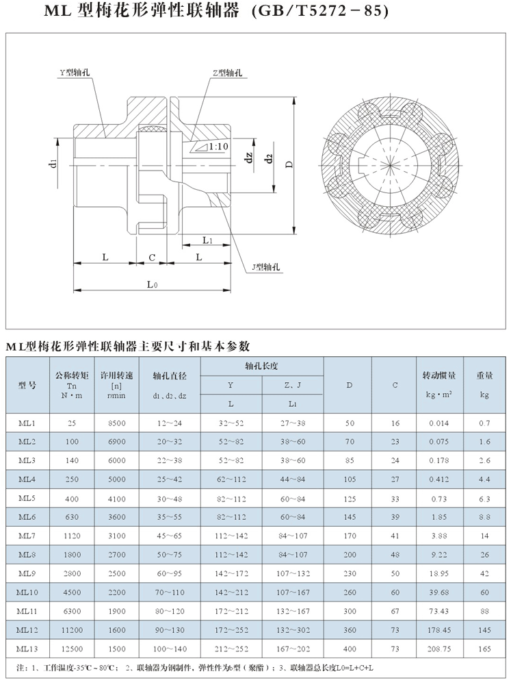 標(biāo)記示例:ML3型梅花形彈性聯(lián)軸器MT3 彈性件硬度≥75HZ